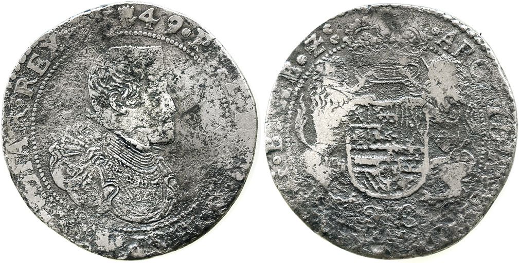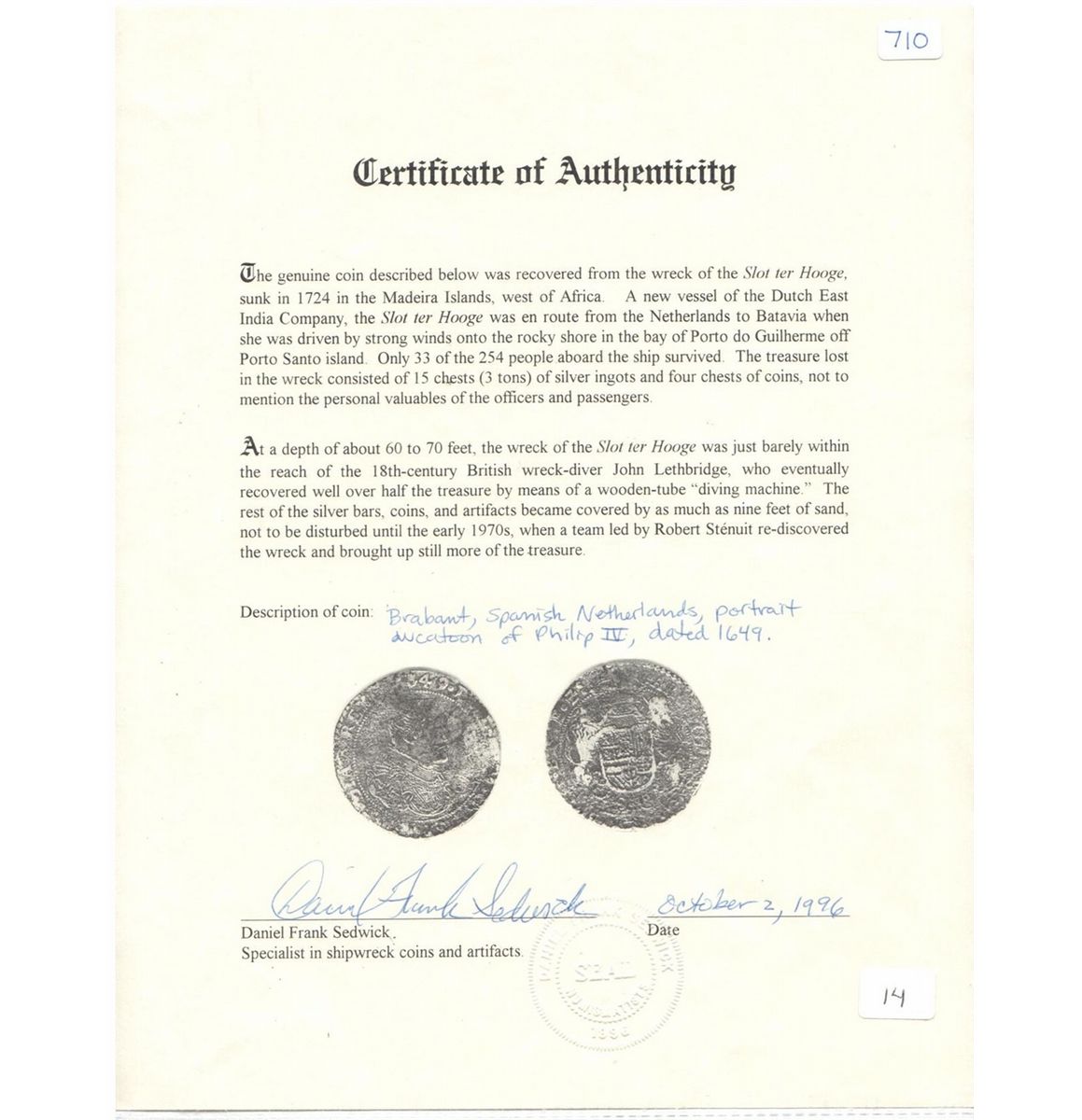 Brabant, Spanish Netherlands (Antwerp mint), portrait ducatoon, Philip IV, 1649. KM-72.1. 29.8 grams. Lightly worn and corroded but with bold date and good portrait, some toning. With Sedwick certificate from 1996. Recovered from: Slot ter Hooge, sunk in 1724 off the Madeira Islands, northwest of Africa