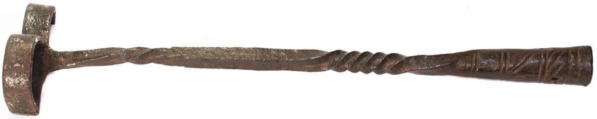 Branding iron for monogrammed "JP" mark, British, 1600s. 766 grams, 18" long. If your initials are JP, then you need this piece to mark your cattle! The iron is solid and not rusty, with twisted square shank terminating in a wrapped-cylindrical socket at top (for inserting a pole), clearly old in design but still perfectly functional.