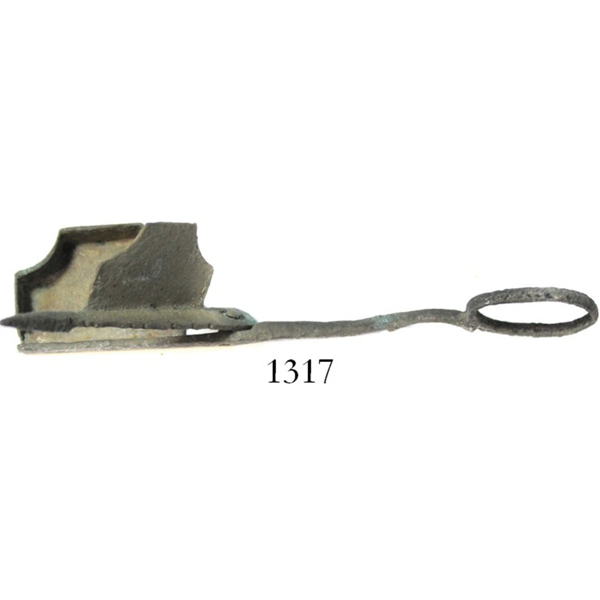 Brass candle snuffer, missing one handle. 63 grams, 7" long. Basically a pair of scissors with flat pan to one side for catching the trimmed wick, this piece would be completely intact were it not for the absence of the lower arm, still neat for display. Pedigreed to the Marty Meylach collection. Recovered from:Spanish 1733 Fleet, Florida Keys