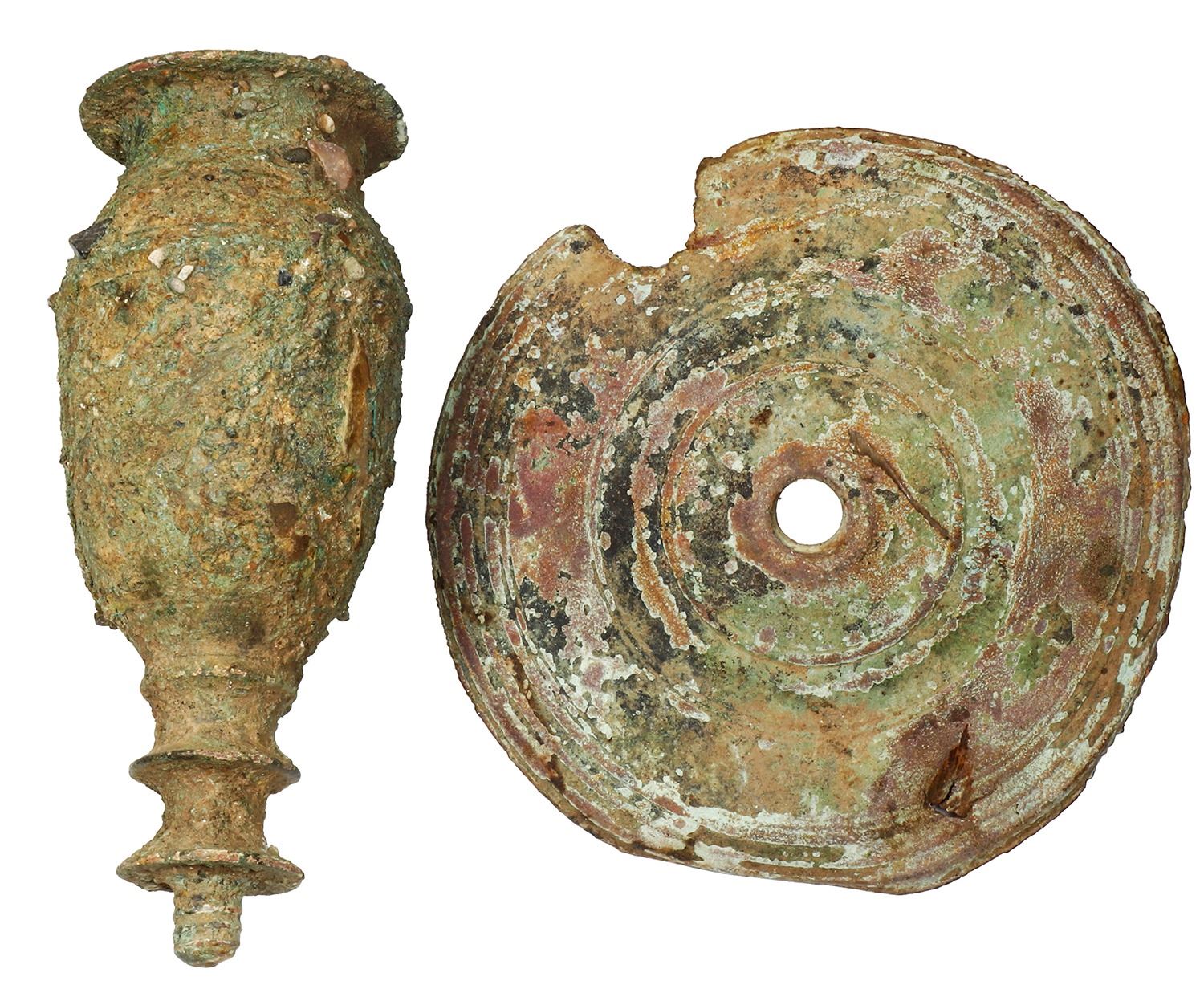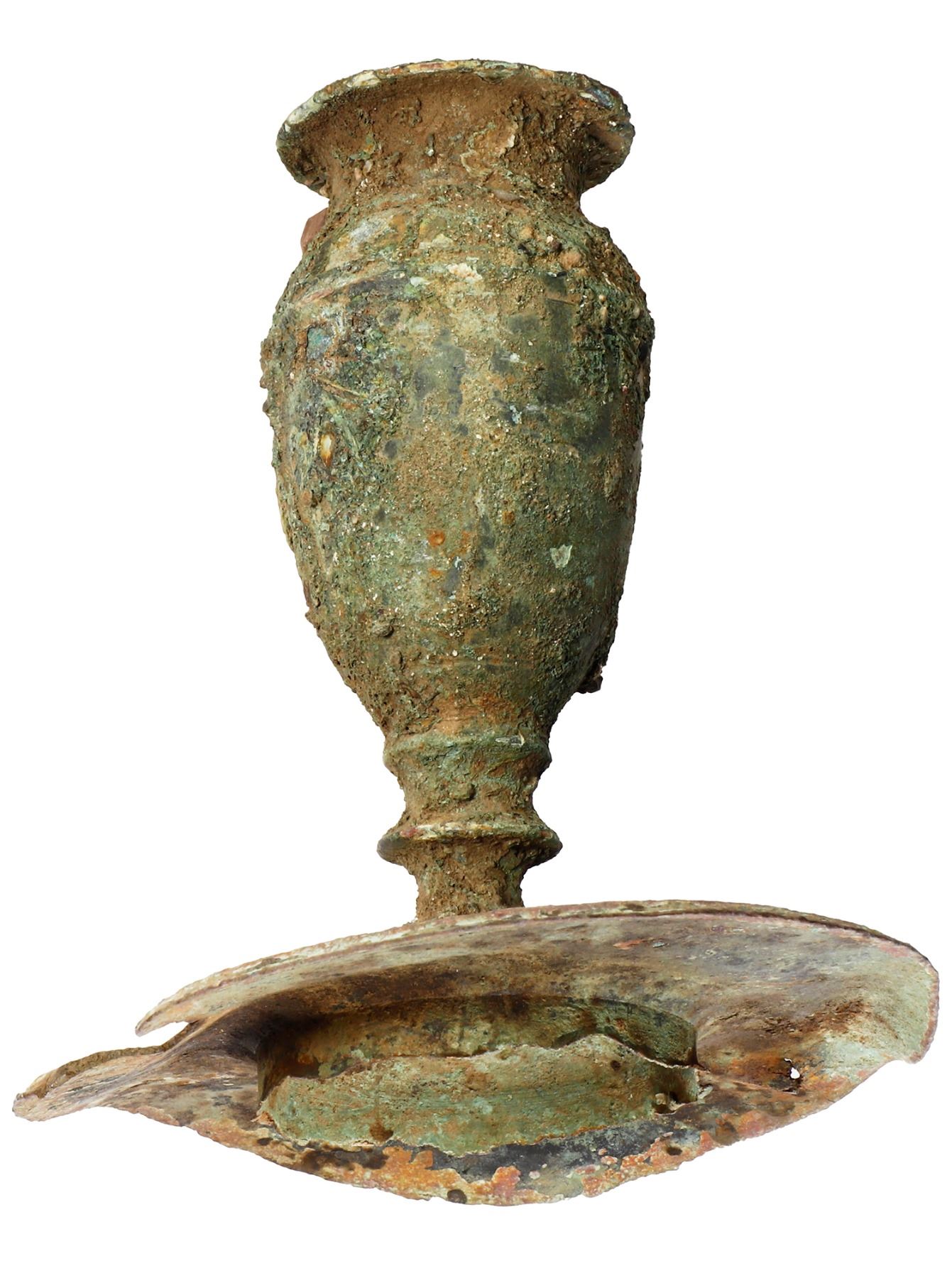 Brass candlestick holder (two parts), intact but heavily patinated, Spanish colonial, 1500s-1600s. 379 grams total. 5" tall, 4½" diameter base. Two solid pieces of a candlestick holder with much encrustation and green patina. Both are complete and well preserved. Pedigreed to Sedwick Auction 22, with original lot-tag 1537.