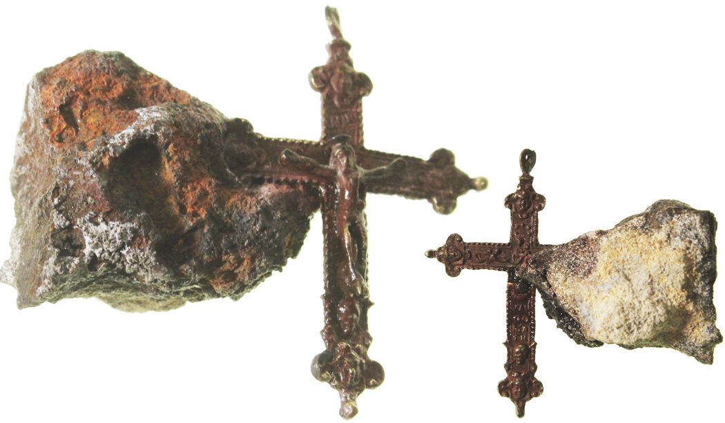 Brass cross with Jesus figure (complete) encrusted into piece of impacted debris. 33.6 grams, roughly 2-1/2" x 2". In addition to emeralds, this outbound Spanish ship was carrying religious medallions, crucifixes and crosses for converting the natives, and of the last-mentioned this piece is probably the best we've ever seen, completely intact and with intricate design on both sides, the Jesus figure applied on front above a small skull-and-crossbones for Golgotha, with left arm embedded in a thick, rock-like chunk of orange and white, the cross itself a dark brown color all over. With Frank and Daniel Sedwick certificate from 1995. Recovered from: San Geronimo, sunk in 1751 off the Yucatan peninsula of Mexico