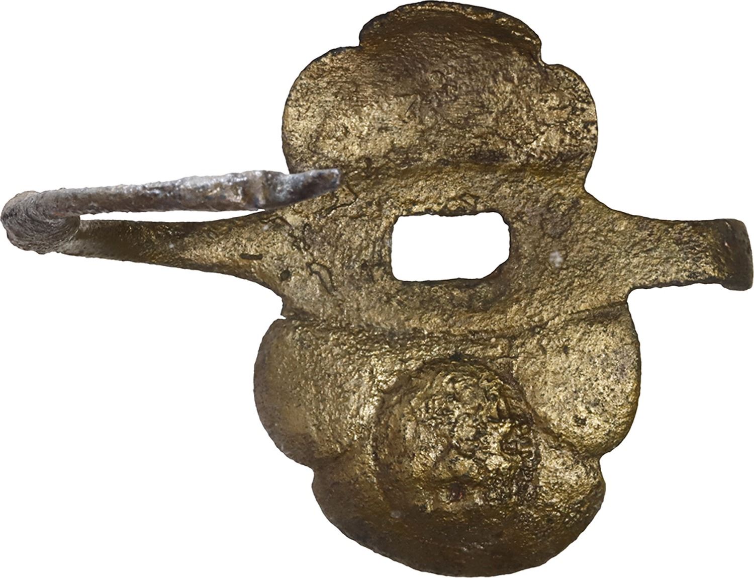 Brass knuckle-guard for a sword, ex-Guadalupe-Tolosa (1724). 95 grams. 5" x 4". Intact guard that would fit between a grip and sword, light goldish color, lots of interesting pitting. From the Guadalupe-Tolosa (1724), with original certificate from Captain Tracy Bowden through his contract with the Dominican Republic and copy of the article "Graveyard of the Quicksilver Galleons" by Mendel Peterson from the December 1979 issue of National Geographic.