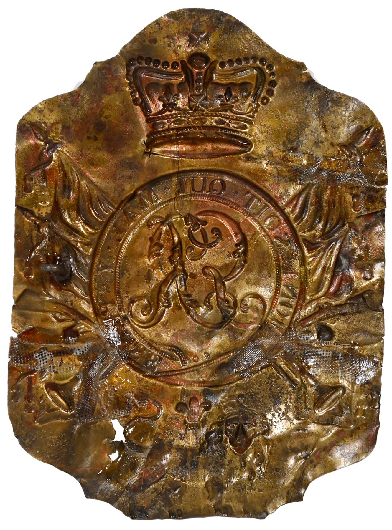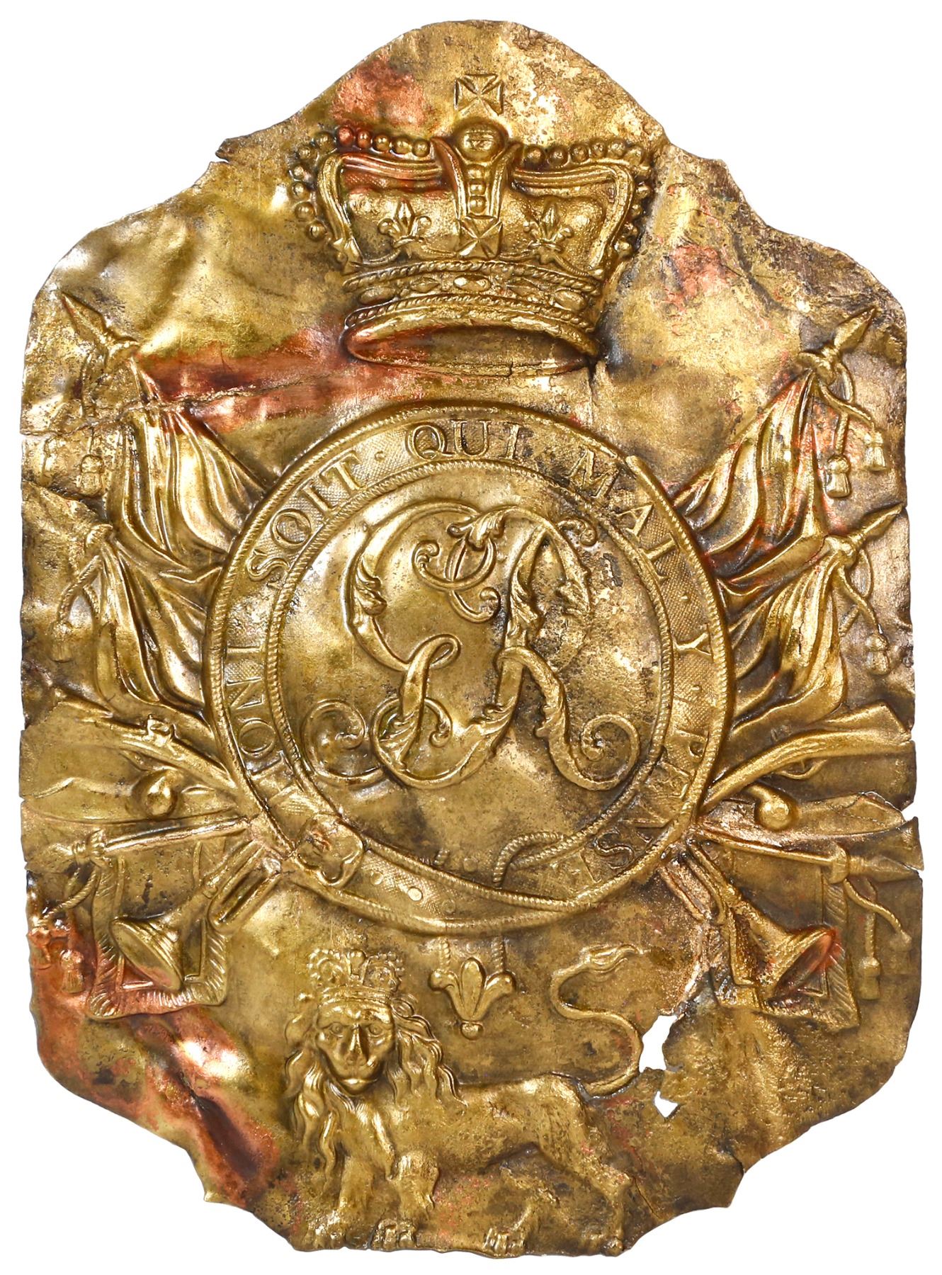 Brass shako plate, British, universal pattern, ex-Lady Burgess (1806), ex-Sotheby's, ex-Cowan. 35 grams. 6" x 4-1/8". British Napoleonic War general service pattern "stovepipe" hat shako plate in brass, with numerous repairs on the underside, still retaining attractive motifs and coloring, with Latin phrase in center meaning "shame on him who thinks evil of it.". From the Lady Burgess (1806), pedigreed to the Rex Cowan Collection and the Sotheby's auction of December 19, 2000 (lot 461b), with copy of invoice.