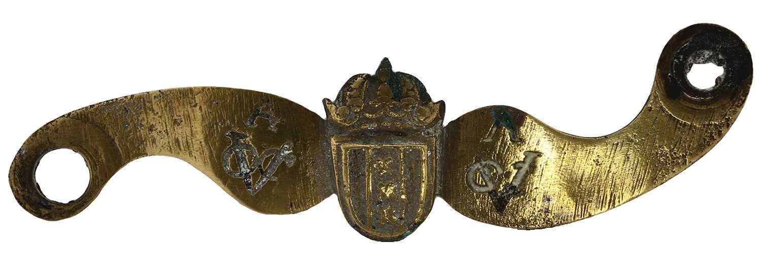 Brass sideplate for a flintlock pistol marked with Amsterdam VOC stamps, ex-Hollandia (1743). 21 grams, 4" x 1". Interesting artifact, very attractive and in good condition, the decoration a shield in center with two wings on either side, holes for mounting to a weapon. From the Hollandia (1743), with original certificate from the salvor.