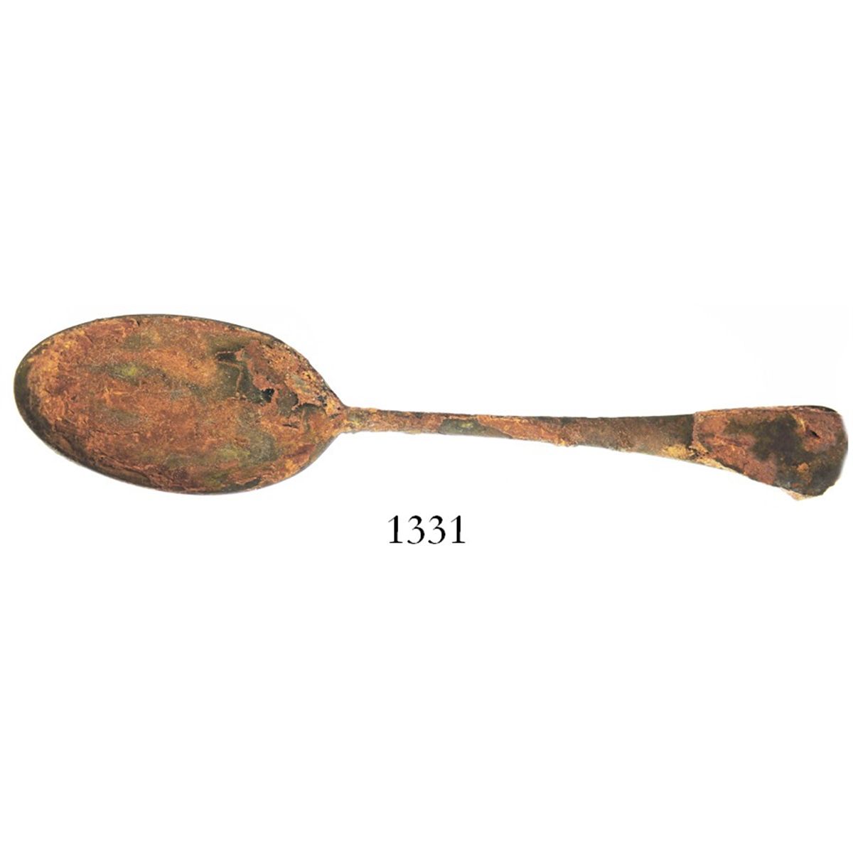 Brass spoon, intact but encrusted. 34.3 grams, 7" long with 2-1/2" x 1-1/2" bowl. A complete but plain, thin-metal spoon with lots of dark orange encrustation and part of another handle on top, possibly marked (need to clean it to find out!). With Sedwick certificate from 2005. Recovered from:Rosario, sunk in 1753 off Montevideo, Uruguay