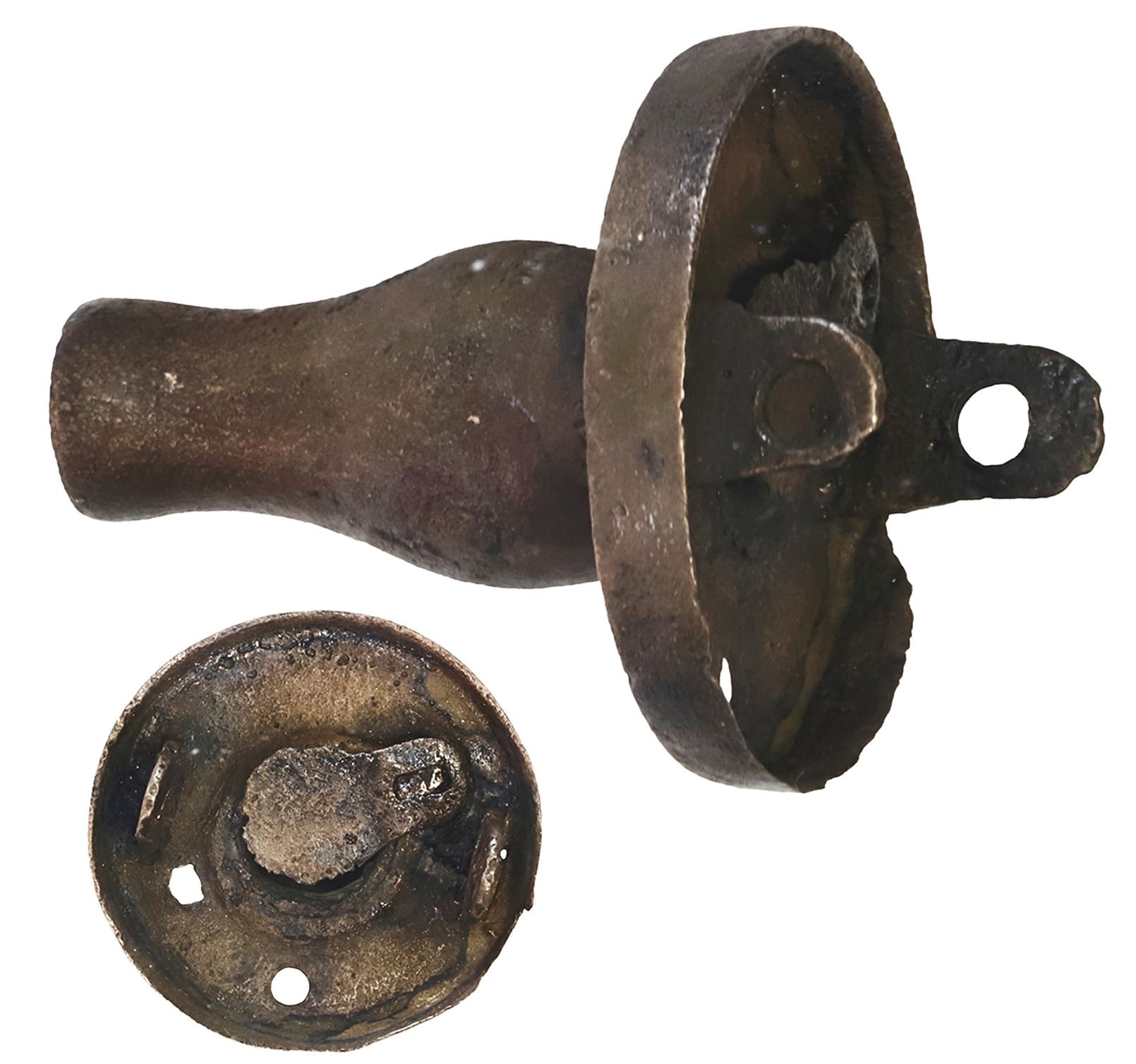 Brass spout for a gunpowder-flask, ex-Guadalupe-Tolosa (1724). 64 grams. 2" long. Intact spout with bulbous nozzle below which is a control lever that affixed to a leather bag for dispensing lead shot or gunpowder. From the Guadalupe-Tolosa (1724), with original certificate from Captain Tracy Bowden through his contract with the Dominican Republic and copy of the article "Graveyard of the Quicksilver Galleons" by Mendel Peterson from the December 1979 issue of National Geographic.
