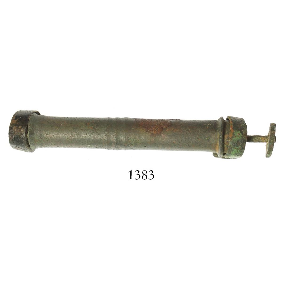 Brass syringe, Spanish colonial (1500s). 55 grams, 4-1/2" long and about 5/8" in diameter. A small tube with small-holed caps at both ends, thin plunger with round-disk end outside and cloth-wrapped cylinder inside, fully intact (missing only the needle) but heavily patinated.
