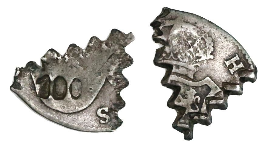 Brazil, 1/4-cut "balastraca" 100 reis (1864-70) cut from a mainland Spain bust 2 reales of Charles I