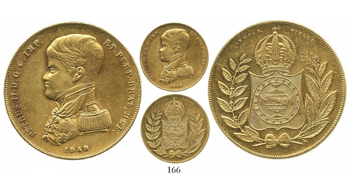Brazil, 10000 reis, Pedro II ("admiral" bust), 1848/7, unlisted overdate. R-O628 (unlisted overdate); KM-457. 14.3 grams. Lustrous UNC with just a couple hairlines and tiny pockmarks, very low mintage (4,567 struck), and very rare in this grade, this date much rarer than the 1847 (of which 25,791 were struck), rarer still with the overdate that is unlisted in Russo. Pedigreed to the New England Collection, with collector's tag from 12/11/1939.