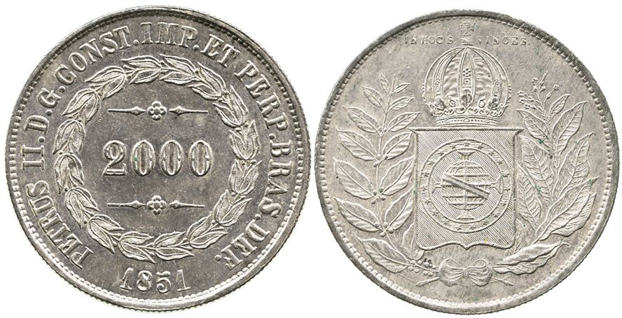Brazil, 2000 reis, Pedro II, 1851. KM-462. 25.4 grams. Choice, lustrous Mint State, just a few bagmarks only, with hint of toning.