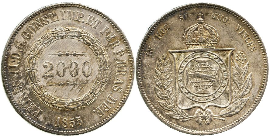 Brazil, 2000 reis, Pedro II, 1855. KM-466. 25.4 grams. UNC with bagmarks, lustrous and lightly rainbow-toned, good strike.