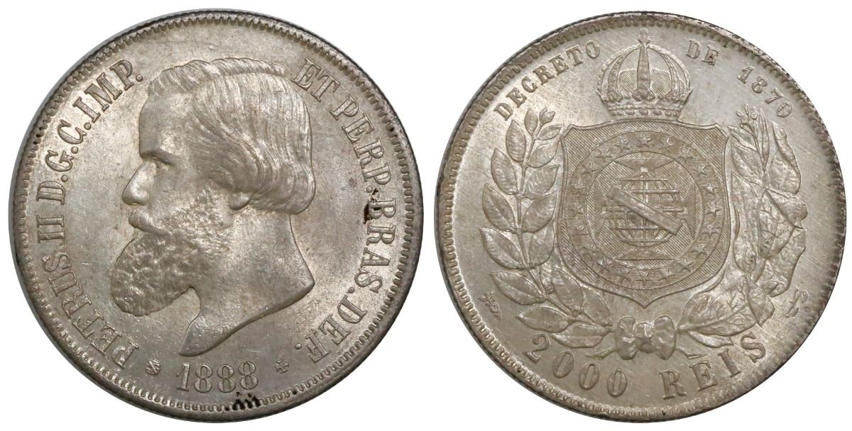 Brazil, 2000 reis, Pedro II, 1888. KM-485. 25.56 grams. UNC with muted luster, strong planchet adjustment lines on reverse.