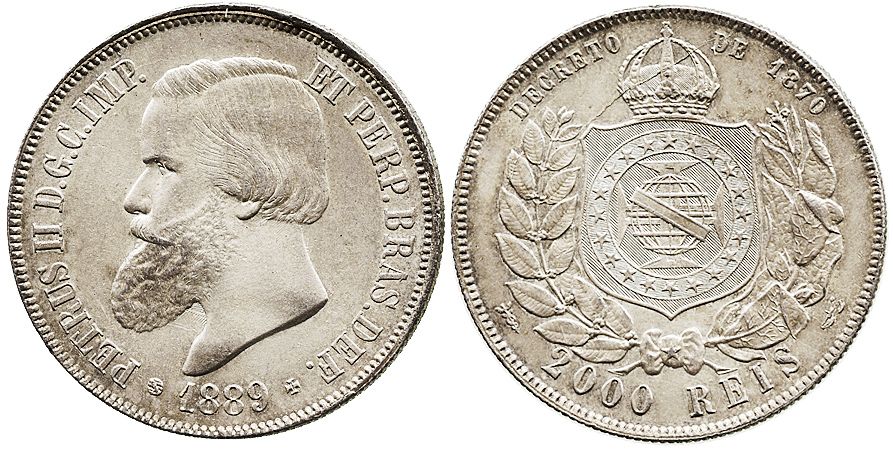 Brazil, 2000 reis, Pedro II, 1889. KM-485. 25.5 grams. Choice AU with muted luster and very light toning, final date of imperial series.
