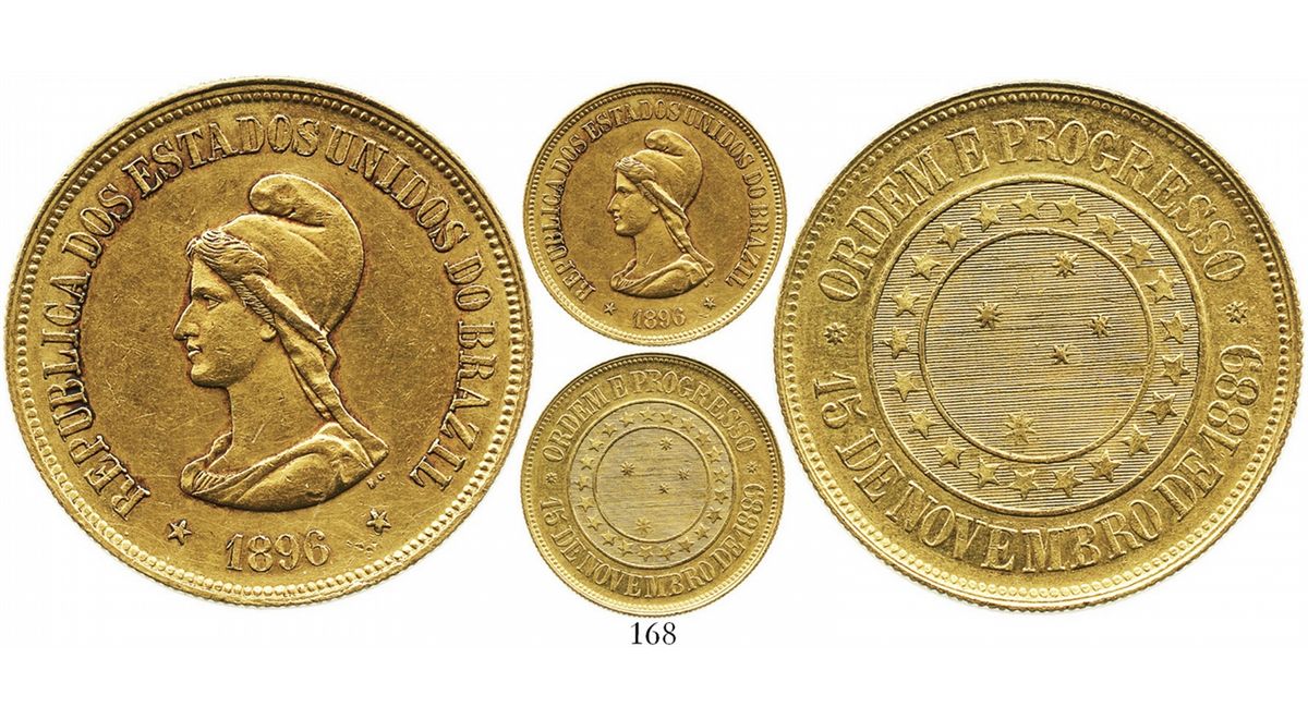 Brazil, 20000 reis, 1896. R-O716; KM-497. 17.8 grams. Nice AU with light surface hairlines, some dark spots around letters of legend, low mintage (7,043 struck). Pedigreed to the New England Collection.