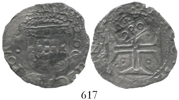 Brazil, 250 reis ("280" [probably S/backwards S] countermark of 1663 on a Lisbon, Portugal, 200 reis of John IV). KM-33.2. 5.6 grams. Corroded and crude but with bold full cross and countermark, darkly toned. From the Sacramento, sunk in 1668 off Bay of All Saints, Bahia, Brazil.