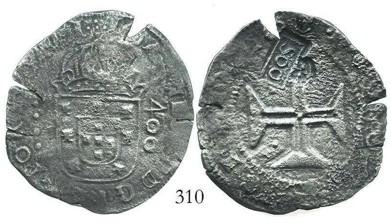 Brazil, 500 reis ("S00" countermark of 1663 on Lisbon, Portugal, 400 reis of John IV). 14.5 grams. Bold and deep countermark, good full crown and shield and cross, bold denomination 400, less corrosion than most but with many tiny edge-splits. Recovered from: Sacramento, sunk in 1668 off Bay of All Saints, Bahia, Brazil