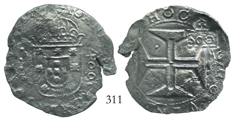 Brazil, 500 reis ("S00" countermark of 1663 on Lisbon, Portugal, 400 reis of John IV). 13.9 grams. Bold full cross with deep countermark in the periphery, full crown and shield with 400 to right, lightly corroded, with crack in edge. Recovered from: Sacramento, sunk in 1668 off Bay of All Saints, Bahia, Brazil