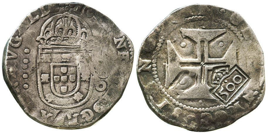 Brazil, 500 reis, crowned-"500" countermark (1663) on a Lisbon, Portugal, 400 reis of Joao IV. KM-36. 22.1 grams. Attractively toned AVF with very full and bold countermark, nice inner details and most of legends.