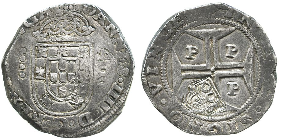 Brazil, 500 reis, crowned-"S00" countermark (1663) on a Porto, Portugal, 400 reis of Joao IV.
