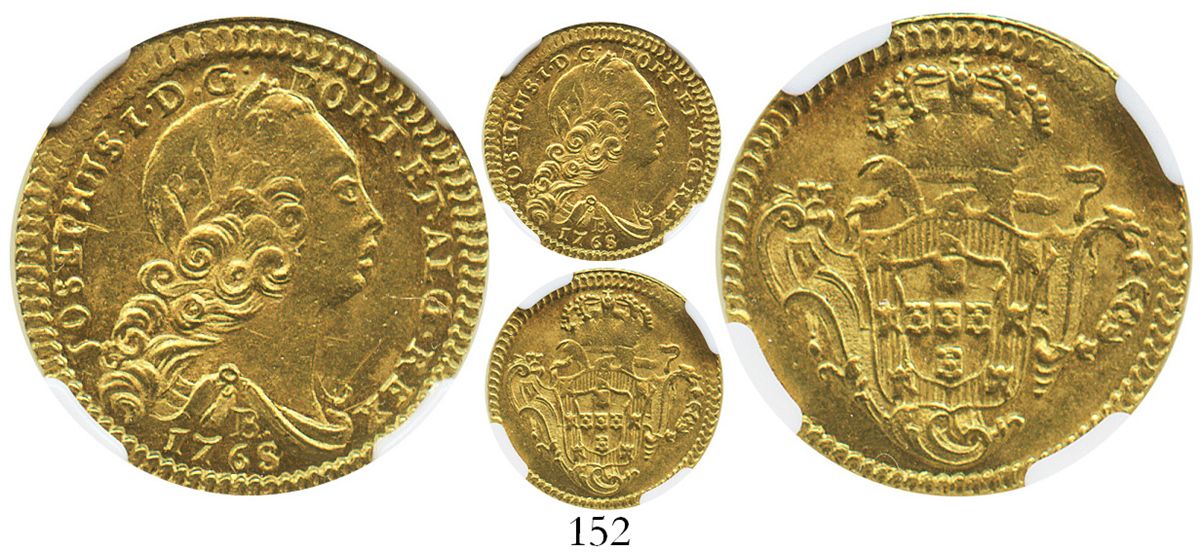 Brazil (Bahia mint), 1600 reis, Jose I, 1768-B, encapsulated NGC AU 58, finest known graded by NGC, extremely rare. R-O362; KM-181.1. Bold and lustrous, the broad flan extending beyond the rims, quite conservatively graded in our opinion, as its flashy appearance and pristine surfaces seem to have been played down without other examples for reference, the only other one known to us being AU 50 and visibly much lower in quality. In any case the present coin is the finest known by far. Any date of this mint in this denomination is extremely rare, in any grade, with usually only one or a few known for each date, in comparison with the far more common Rio-mint production of the same denomination in a narrower date range but in larger quantities. Pedigreed to the New England Collection.