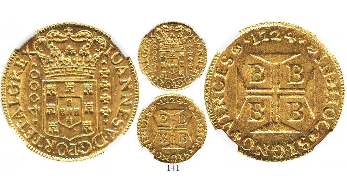 Brazil (Bahia mint), 4000 reis, Joao V, 1724-B, encapsulated NGC MS 65, finest known specimen graded by NGC. R-O070; KM-106. Lustrous and choice in every regard, in fact finest known by two grades, its only minor flaw being light adjustment marks on reverse, extremely rare in this condition. Pedigreed to the New England Collection, with collector's tag from 7/28/1960.