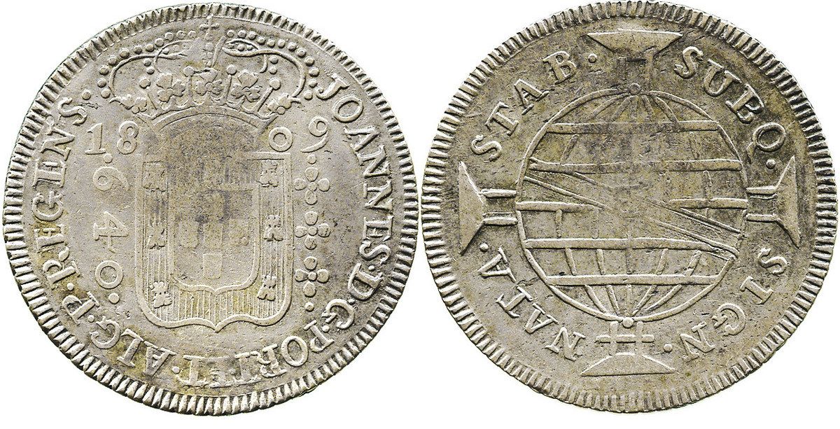 Brazil (Bahia mint), 640 reis, 1809-B. KM-256.1. 19.6 grams. VF+ with weak strike near centers, hint of toning and luster.