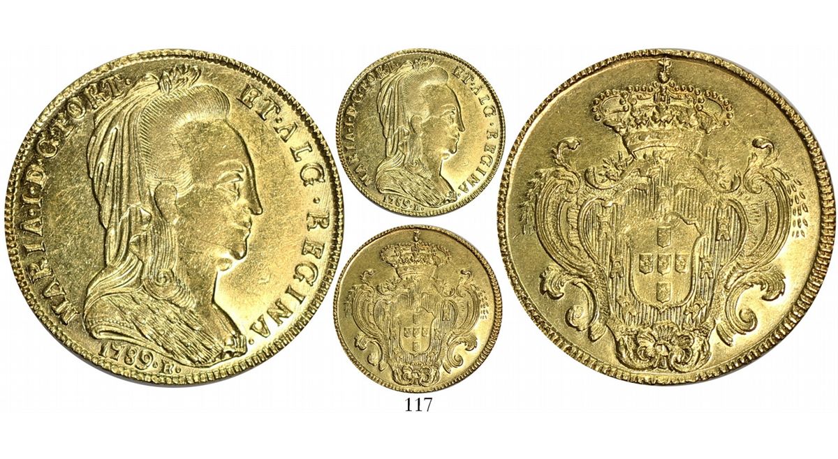 Brazil (Bahia mint), 6400 reis, Maria I (widow bust), 1789-B, modified Rio dies. Russo-506; KM-218.2. 14.10 grams. Highly lustrous and well-struck, with mintmark re-engraved from R to B and with Rio-style bust. Pedigreed to the New England Collection.