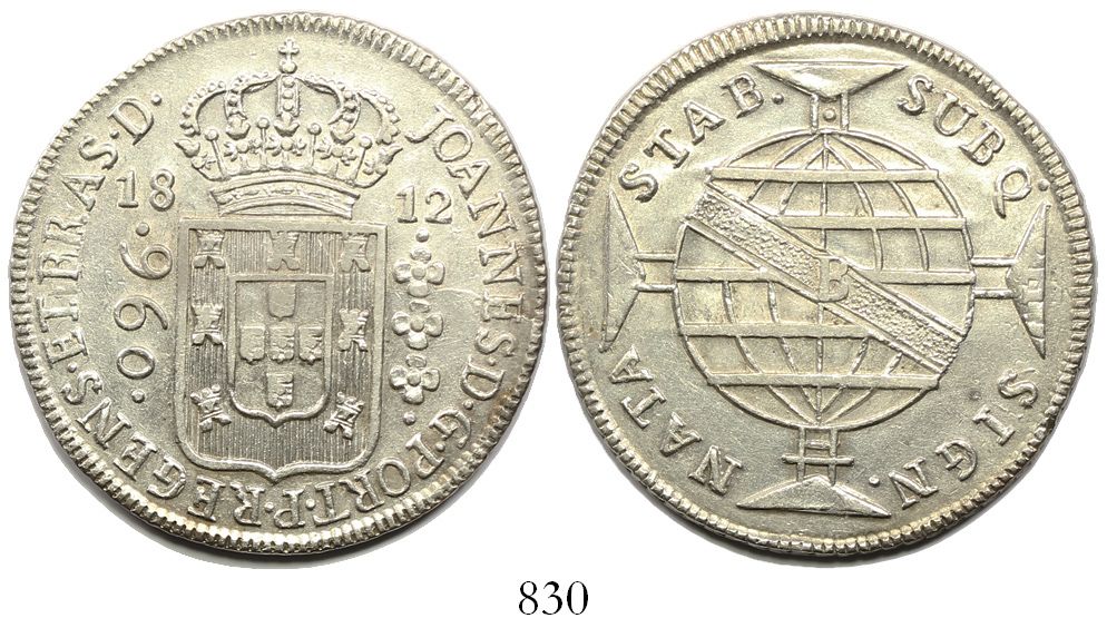 Brazil (Bahia mint), 960 reis, Joao Prince Regent, 1812-B, struck over a Valencia, Spain, 8 reales, 1811GS. Russo-397; KM-307.1. 26.69 grams. Bold and lustrous AU+ (no toning) with only traces of the undercoin visible but enough to attribute (unusual host). With old envelope from previous collector.