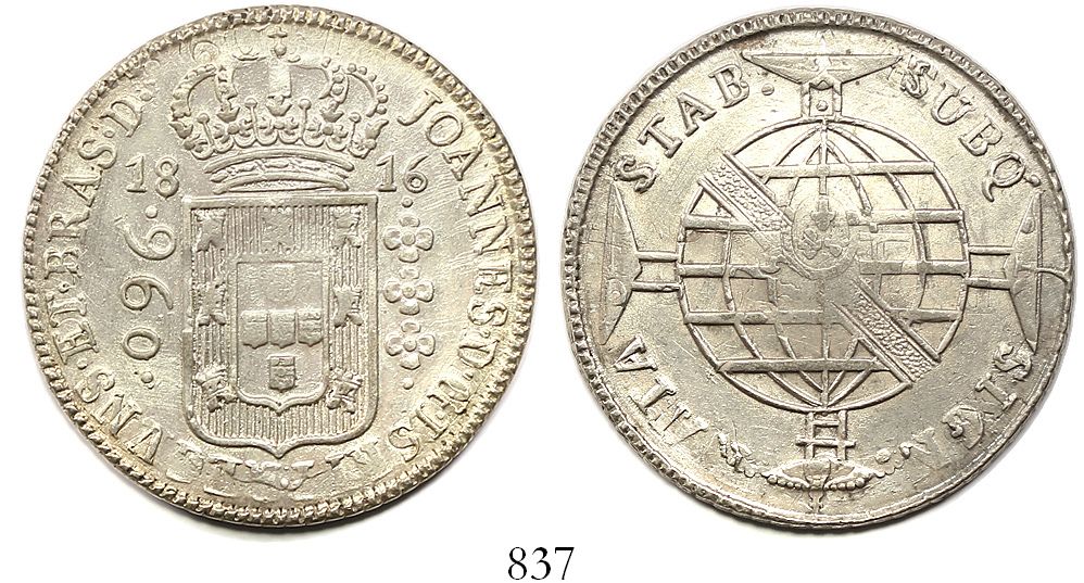 Brazil (Bahia mint), 960 reis, Joao Prince Regent, 1816-B, struck over a Seville, Spain, 8 reales, 1809CN. Russo-401a; KM-307.1. 27.08 grams. Very lustrous AU+ with weak centers, some undercoin details. With old envelope from previous collector.