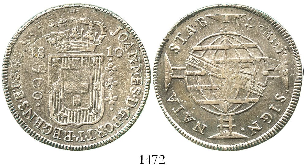 Brazil (Bahia mint), 960 reis, Joao VI, 1810-B, struck over a Santiago, Chile, bust 8 reales of Charles III, 1782DA. KM-307.1. 26.8 grams. Undercoin date and mintmark fully visible (rare thus), choice XF with muted luster. With old, original collector's sticker with handwritten notes.