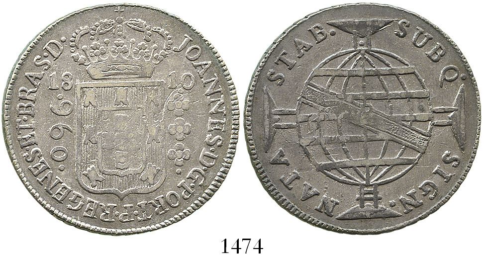 Brazil (Bahia mint), 960 reis, Joao VI, 1810-B, struck over a Spanish colonial bust 8 reales (probably Lima, Peru, 1805JP). KM-307.1. 26.8 grams. XF with light toning and luster, weak centers, only small bits of the undercoin visible. With old, original collector's paper envelope with handwritten notes.