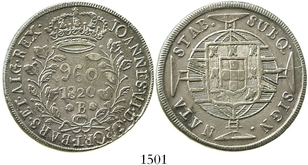 Brazil (Bahia mint), 960 reis, Joao VI, 1820-B, "BARS" variety, struck over a Potosi, Bolivia, but 8 reales of 1815PJ. KM-326.2. 26.7 grams. Lustrous XF with very light toning, clear undercoin date. With old, original collector's paper envelope with handwritten notes.
