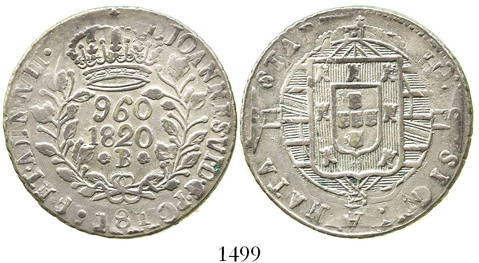 Brazil (Bahia mint), 960 reis, Joao VI, 1820-B, struck over a Cadiz, Spain, bust 8 reales of 1813GJ. KM-326.2. 26.5 grams. Bold undercoin date (rare thus) and other details, XF with light toning and underlying luster. With old, original collector's paper envelope with handwritten notes.