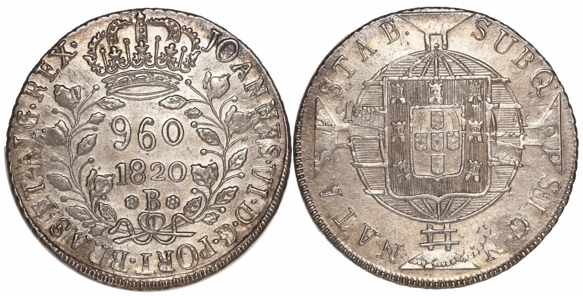 Brazil (Bahia mint), 960 reis, Joao VI, 1820-B, struck over a Madrid, Spain, bust 8 reales of Ferdinand VII, assayer GJ (1814-18). 26.75 grams. Lustrous AU- with lots of undercoin details on reverse only, slightly off-center strike, faint toning near rims.
