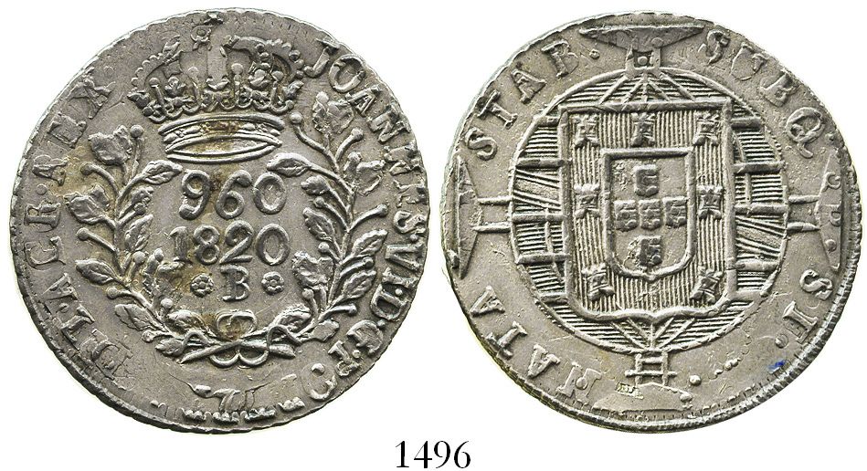 Brazil (Bahia mint), 960 reis, Joao VI, 1820-B, struck over a Mexico City, Mexico, bust 8 reales (probably 1783FF). KM-326.2. 26.6 grams. Bold, lustrous AU- with very light toning, much undercoin detail visible. With old, original collector's paper envelope with handwritten notes.