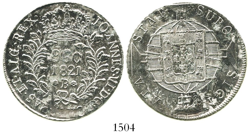 Brazil (Bahia mint), 960 reis, Joao VI, 1821-B, reverse struck from a Rio-mint die (rare), struck over a Spanish colonial bust 8 reales. KM-326.2. 27.0 grams. Highly lustrous Mint State (no toning). With old, original collector's paper envelope with handwritten notes.