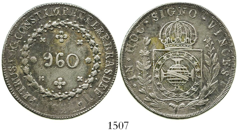 Brazil (Bahia mint), 960 reis, Pedro I, 1824-B, struck over a Guanajuato, Mexico, bust 8 reales of Ferdinand VII, 1822JM. KM-368.2. 26.6 grams. Toned AXF with hint of luster, just enough undercoin details to attribute. With old, original collector's paper envelope with handwritten notes.