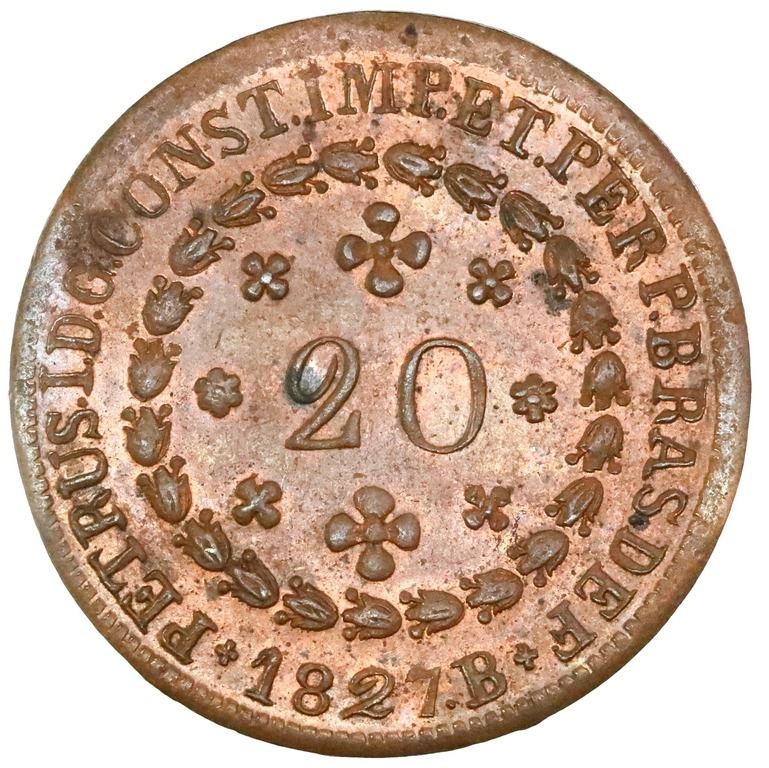Brazil (Bahia mint), copper 20 reis, Pedro I, 1827-B, NGC MS63 BN, finest and only example in NGC census. Russo-634; KM-360.2. Key date struck in about 10% of the quantity of the other dates in the series, this example being the finest on record with bold details against smooth, chocolate-brown surfaces with a hint of copper color and luster, dark spot at 3 o'clock on obverse, crude rims (as made). NGC #5850257-013.