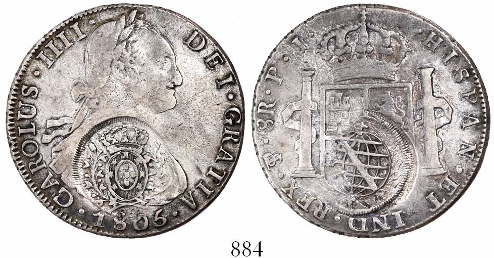 Brazil (Minas Gerais), 960-reis, Joao Prince Regent, crowned-arms counterstamp (1808-10) on a Potosi, Bolivia, bust 8 reales, Charles IV, 1805PJ. KM-242; Russo-450. 26.86 grams. Host and counterstamp both VF+ (the latter weakly struck on one side), slightly off-center strike, lightly rainbow toned all over.