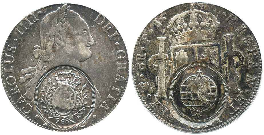 Brazil (Minas Gerais), 960 reis, crowned-arms counterstamp (1808) on a Potosi, Bolivia, bust 8 reales of Charles IV (host date not visible), encapsulated PCGS VF35. KM-242. Very richly toned all over, the counterstamp full but weak in centers.