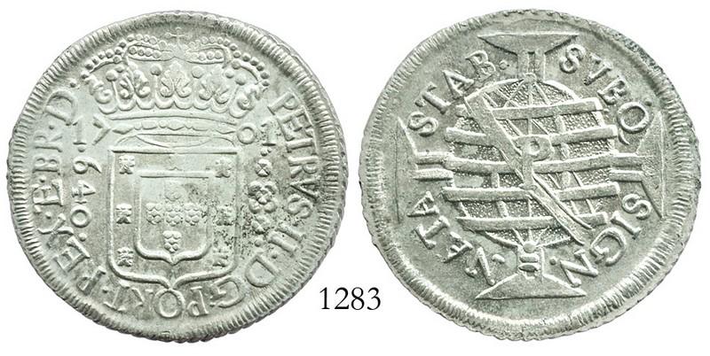 Brazil (Pernambuco mint), 640 reis, 1701-P. KM-90.2. 19.7 grams. Mostly lustrous UNC (exceptional grade for this issue) with full details.