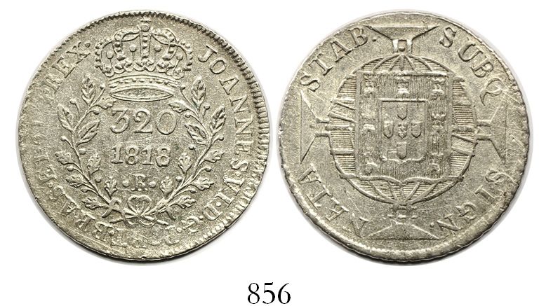 Brazil (Rio mint), 320 reis, Joao VI, 1818-R, no ornaments flanking date. Russo-unl. (cf. 468); KM-324.2. 8.88 grams. Lustrous (lightly cleaned) AU, parts of rim weak due to improper centering, possibly rare variety with neither dots nor crosses flanking the date.