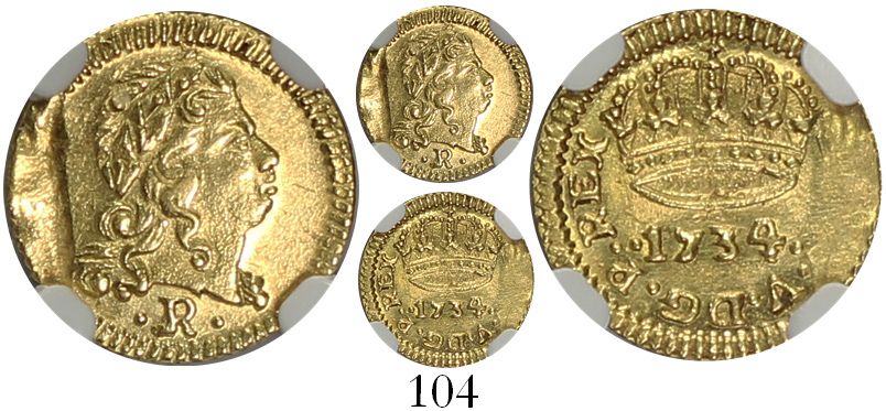 Brazil (Rio mint), 400 reis, Joao V, 1734-R, encapsulated NGC MS 62, finest known in NGC census, ex-Norweb. Russo-198; KM-152. Despite its diminutive size, this one-year Rio type is an iconic piece under Joao V in gold. With beautiful, bright luster all around, this coin exhibits choice inner details and nice rims for about 80% of its circumference, the remaining 20% plagued with a strange mint-flaw (lacuna) that is decidedly natural and not damage. Desirable pedigree. Pedigreed to the New England Collection and to the Norweb Collection (Christie's, March 1997, lot #686), stated in the slab.