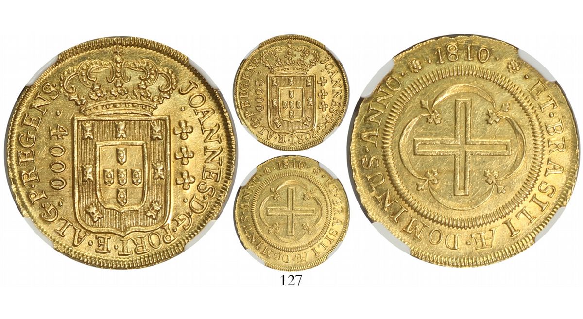 Brazil (Rio mint), 4000 reis, Joao Prince Regent, 1810, encapsulated NGC MS 63, tied for second finest known in NGC census. Russo-570; KM-235.2. Lightly toned, highly lustrous and perfect except for rim at top of reverse, great eye-appeal. Pedigreed to the New England Collection.