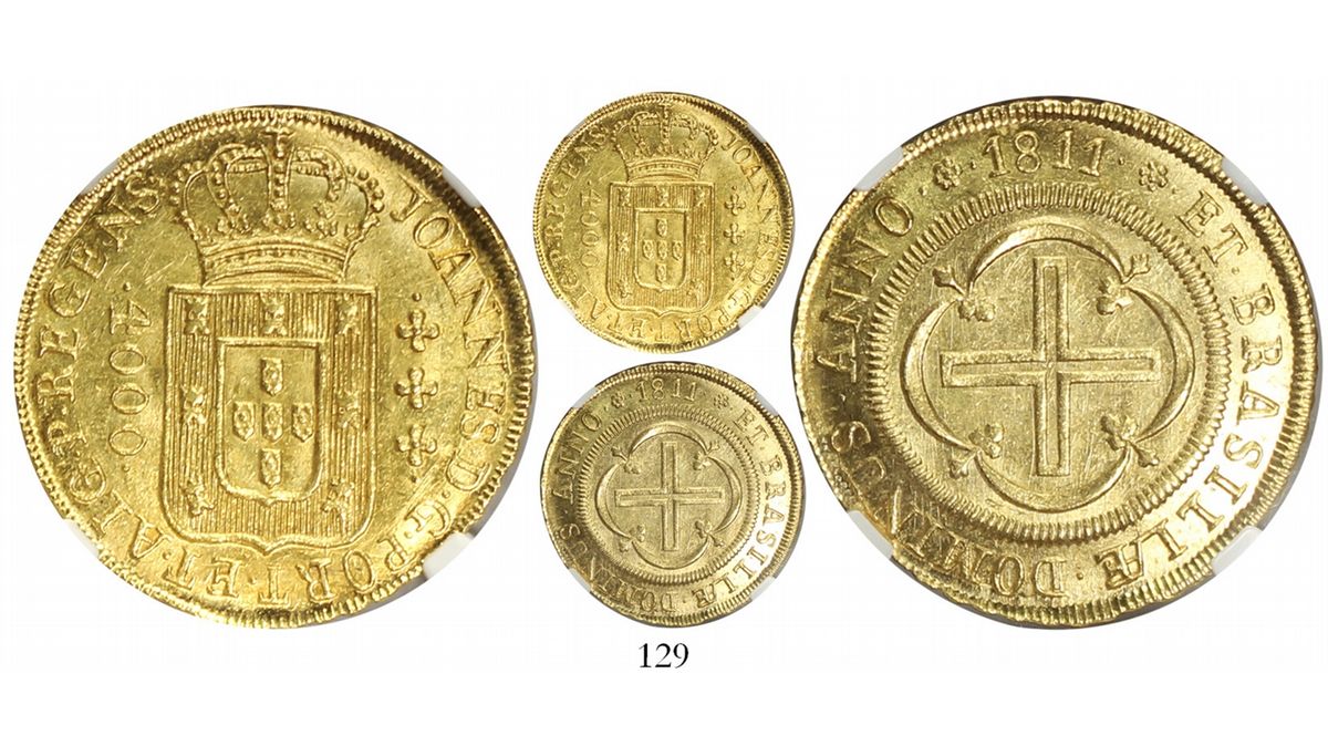 Brazil (Rio mint), 4000 reis, Joao Prince Regent, 1811, encapsulated NGC MS 63, tied for finest known in NGC census. Russo-571; KM-235.2. Blazingly lustrous and sharply struck, the depth of strike most apparent at about 1-2 o'clock on the obverse where the planchet is slightly concave, a lovely gem all around. Pedigreed to the New England Collection.