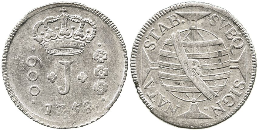 Brazil (Rio mint), 600 reis, 1758-R. KM-187. 17.7 grams. Lustrous AU- with small scrape on reverse, parts of rims weak, choice grade for the type.