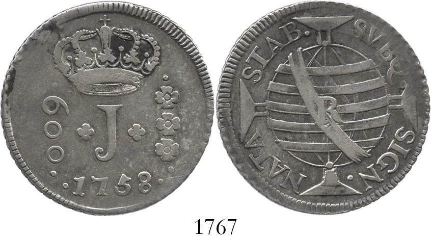 Brazil (Rio mint), 600 reis, 1758-R. KM-187. 18.0 grams. VF/XF with some luster, dark toning in crown, slightly crude edge as usual.