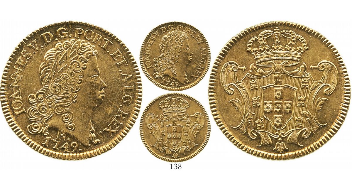 Brazil (Rio mint), 6400 reis, Joao V, 1749-R. R-O224; KM-149. 14.4 grams. Lustrous Mint State (rare grade), die-crack through king's name. Pedigreed to the New England Collection, with collector's tag from 11/6/1944.