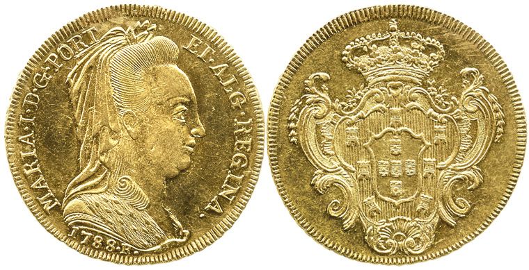Brazil (Rio mint), 6400 reis, Maria I, 1788-R. KM-218.1. 14.3 grams. Lustrous Mint State, no problems.