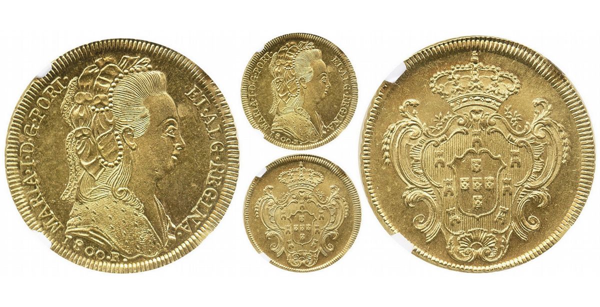Brazil (Rio mint), 6400 reis, Maria I, 1800-R, encapsulated NGC MS 63, second finest known graded by NGC. KM-226.1. Superb luster, minor bagmarks but no wear at all, very flashy.